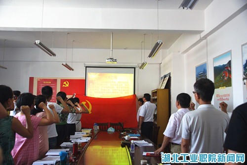 为庆祝中国共产党建党95周年,增强理想信念教育,建筑工程系党总支全体党员在总支副书记周涛带领下面对党旗,重温了入党誓词,再一次激发了全体党员的责任和宗旨意识。