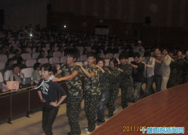 晚会在此起彼伏的拉歌声中揭开序幕;热情火辣的歌词串烧点燃了会场,同学们激情昂扬,活力四射,全场一片沸腾。灯光闪烁,照耀在同学们洋溢着幸福的脸上,军训的疲惫抛至九霄云外。台上,节目异彩纷呈;台下,观众积极配合,雷鸣般的掌声,欢呼声震耳欲聋。动感的街舞表演让全场观众掌声四起;钟骅老师带领大家跳起了兔子舞,将晚会推向了高潮。教官们带头玩起“击鼓传花”的游戏,学子们都纷纷围成一个个大圈,在音乐声中传起军帽。最后大家进行了拉歌比赛,催人泪下的《军中绿花》,斗志昂扬的《学习雷锋好榜样》,气势磅礴《团结就是力量》,将晚会再次推向高潮。
