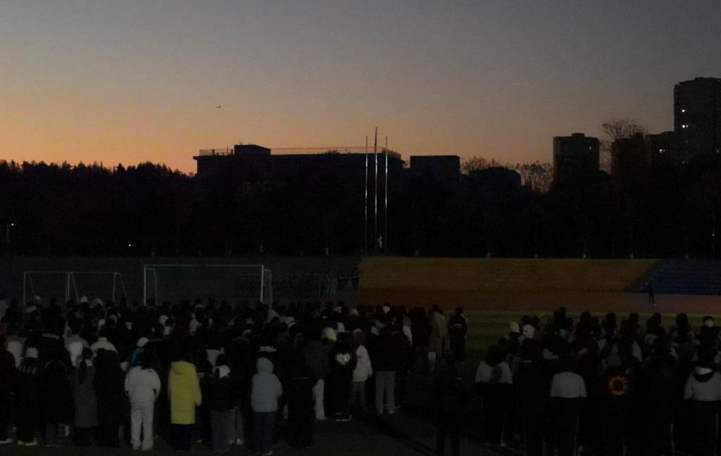 6点50分,师生队伍已整装待发,静待仪式启幕。随着激昂的出旗乐声,护旗手们以铿锵步伐护卫五星红旗步入运动场,旗手以标准军礼庄严示意,全场肃穆,气氛庄重。随后,升国旗、奏国歌环节庄严进行,五星红旗在雄壮的国歌声中缓缓升起,全体师生面向国旗,行注目礼,心中涌动着对祖国的无限崇敬与热爱。