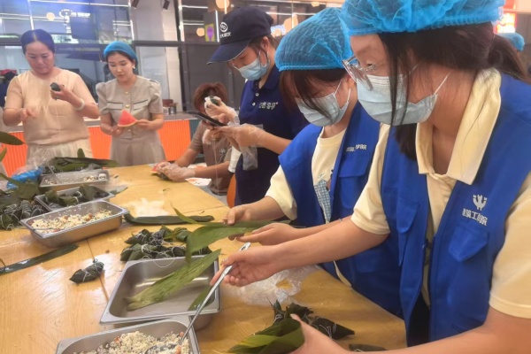 5月29日下午,志愿者们来到公司南区食堂,与食堂工作人员共同准备节日食材,体验包粽子的乐趣。在工作人员的指导下,志愿者们认真学习包粽子的技巧,从折叶、装米到缠线,每一步都充满耐心与热情。活动现场粽叶飘香,其乐融融,不仅让志愿者们感受到劳动的快乐,也拉近了员工与后勤工作人员的距离,传递了温暖与关怀。