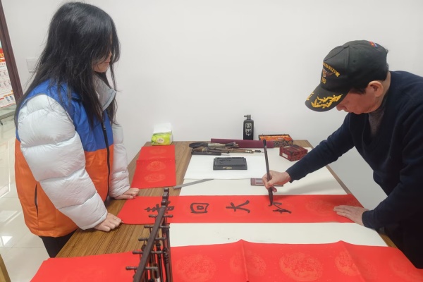 活动现场,长桌排开,红纸铺就,书法创作者们挥毫泼墨,笔走龙蛇。一副副寓意吉祥、满载祝愿的春联在笔尖诞生,一个个形态各异、气韵生动的“福”字跃然纸上。墨香伴随着欢声笑语,吸引了许多居民驻足欣赏、纷纷领取春联。书法创作者们不仅现场创作,还耐心询问居民喜好,将节日的喜悦与温暖融入一笔一划之中。