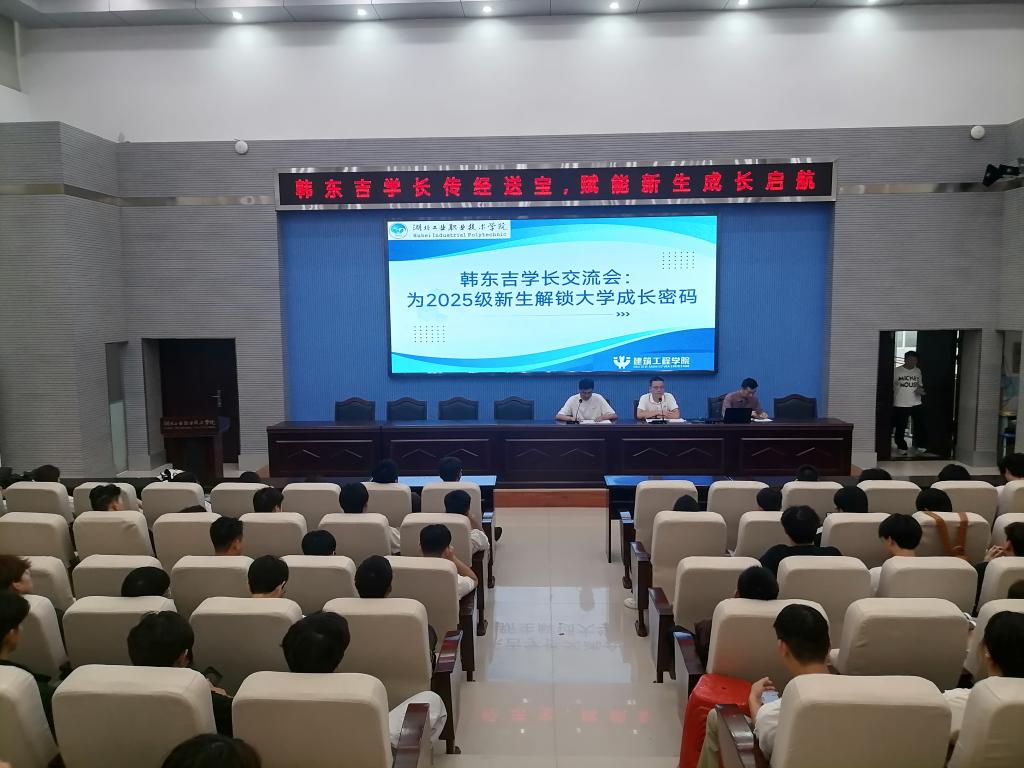 随后,韩东吉员工结合自身经历和智慧,分享了从校园到职场的学习成长感悟。他以“坚持学习是人生赛道的‘指南针’”为核心,讲述了自己在专业深耕中攻克学术难题、在工程实践中积累实战经验的过程,鼓励新生珍惜大学时光,既要扎实掌握专业知识,也要主动参与社会实践,提前适应建筑行业发展需求为同学们绘就绚丽多彩的人生画卷,树立起学习的榜样和前进的标杆。